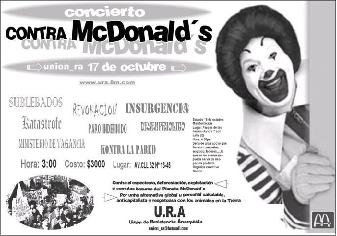 El día 17 de octubre se realizo un concierto en conmemoración al día internacional de la lucha contra mcdonalds - 16 de octubre - Dicho día en el cual se llevo a cabo una manifestación a la cual asistió bastante gente y en la que se realizo una marcha hasta llegar al lugar de un almacén de esta multinacional; se repartió material contrainformativo, se escucharon nuestras consignas…Como tal